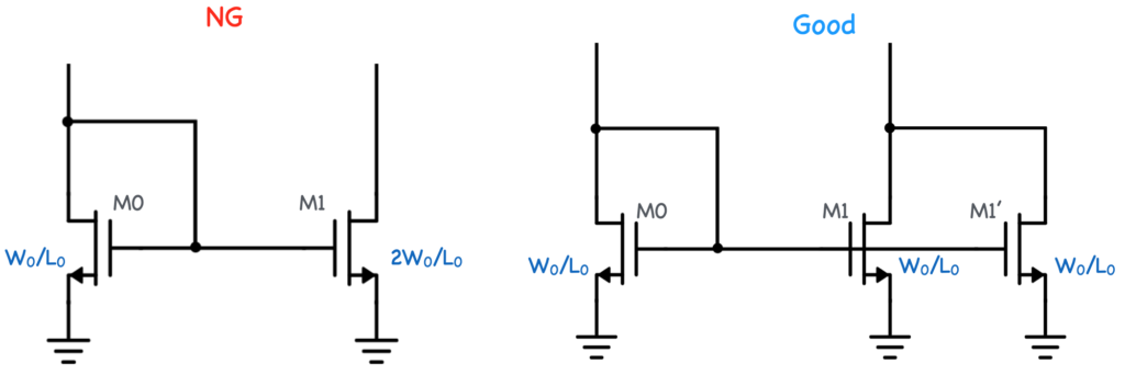第一に、ミラー元と同じサイズのMOSをミラー先で使う必要があります。例えば下図のように参照電流のちょうど2倍の電流を出力したいとき、$M1$の$W$を2倍にしたのでは正確なコピーはできません。これは実際に製造された際にはゲートの端の分だけ有効ゲート幅が小さくなり、$M0$の有効ゲート幅は$W_{eff0}=W_0-W_{d}$であるのに対して、$M1$のそれは$W_{eff1}=2W_0-W_{d}\neq 2*W_{eff0}$となり2倍にはならないためです。正確なコピーのためには下図右のように全く同じ寸法のMOSを並列に並べます。